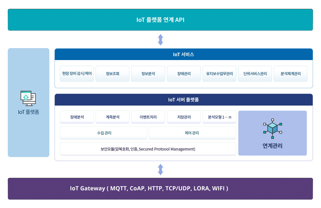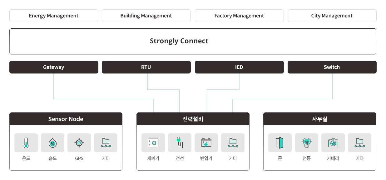 분산된 센서와 설비로 이루어진 다양한 유형에 맞게 서비스를 제공하고자 유무선 통신으로 구성되어 이루어진 솔루션이다.